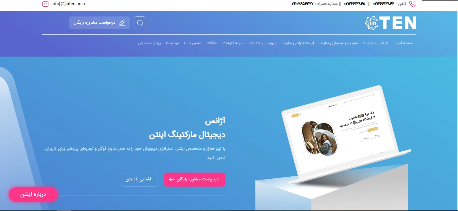 اگر می خواهید خدمات شرکت طراحی سایت را از یک شرکت با سابقه و قدیمی دریافت کنید، اینتن آسیا را به شما معرفی می کنیم که بیش از ۱۰ سال در این حوزه تجربه دارد. این مجموعه در حوزه دیجیتال مارکتینگ و خدمات سئو در ایران حرف اول را می زند. بیشتر نمونه کارهای این مجموعه شرکتی است و اغلب آن ها با استفاده از وردپرس و به صورت کدنویسی اختصاصی اجرا شده اند. فعالیت هایی چون سئو، هاستینگ و ارائه مشاوره رایگان به مشتریان؛ باعث شهرت این شرکت طراحی سایت اختصاصی شده است.