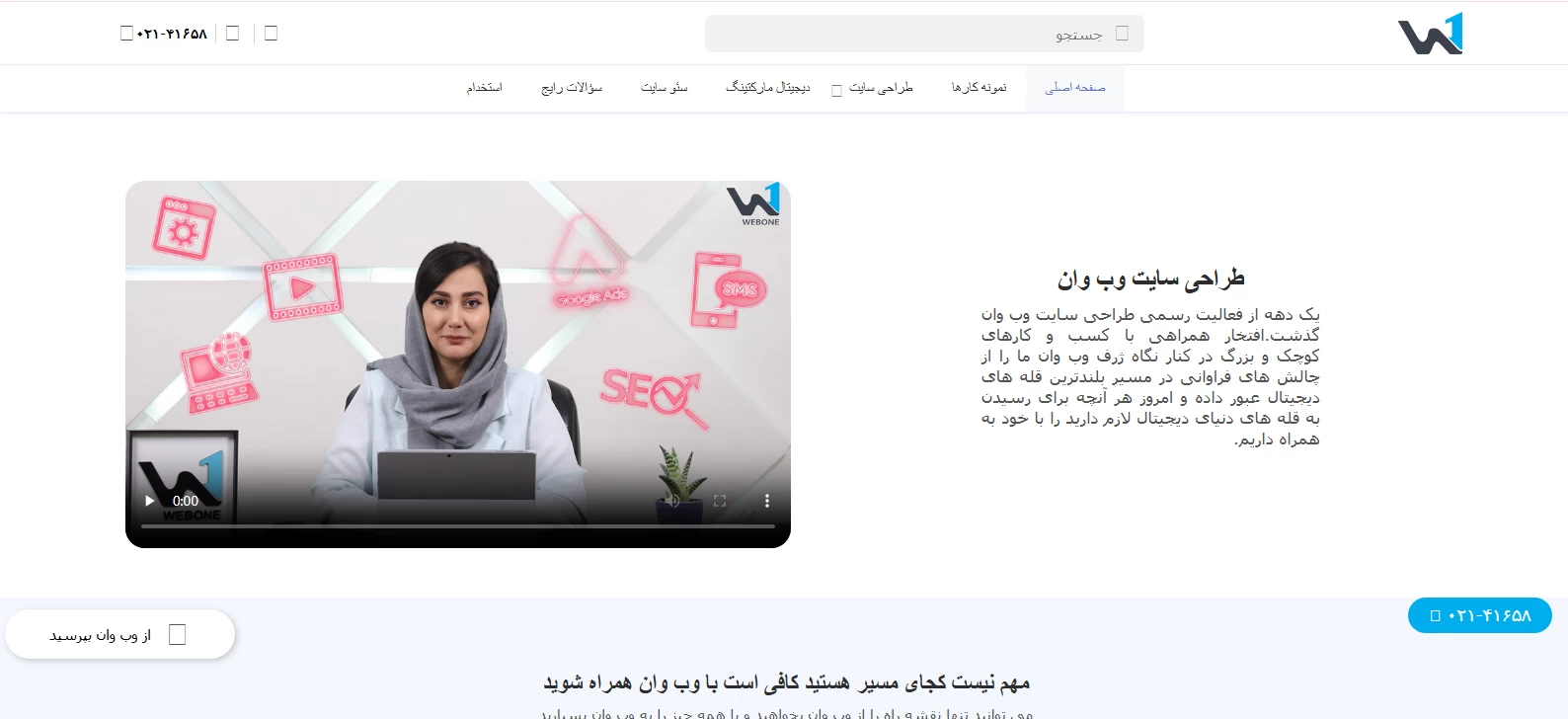 یکی از شرکت هایی که در زمینه طراحی سایت و سئو در صفحه اول گوگل قرار دارد، شرکت وب وان است که فعالیت خود را از سال ۱۳۸۷ آغاز کرده است. طراحی زیبای وب سایت این شرکت و فعالیت های حرفه ای در زمینه عکاسی تبلیغاتی نشان می دهد که به اندازه کافی مهارت دارند. از دیگر ویژگی های این شرکت طراحی سایت می توان به پلن های ارزان آن ها اشاره نمود. این شرکت اغلب وب سایت هایی با قالب آماده و ساده برای مشتریان در نظر گرفته است. البته در کنار این قالب های آماده و ساده، طراحی سایت اختصاصی و کدنویسی نیز طبق کاتالوگ و با استفاده از تکنولوژی های نوین انجام می شود.