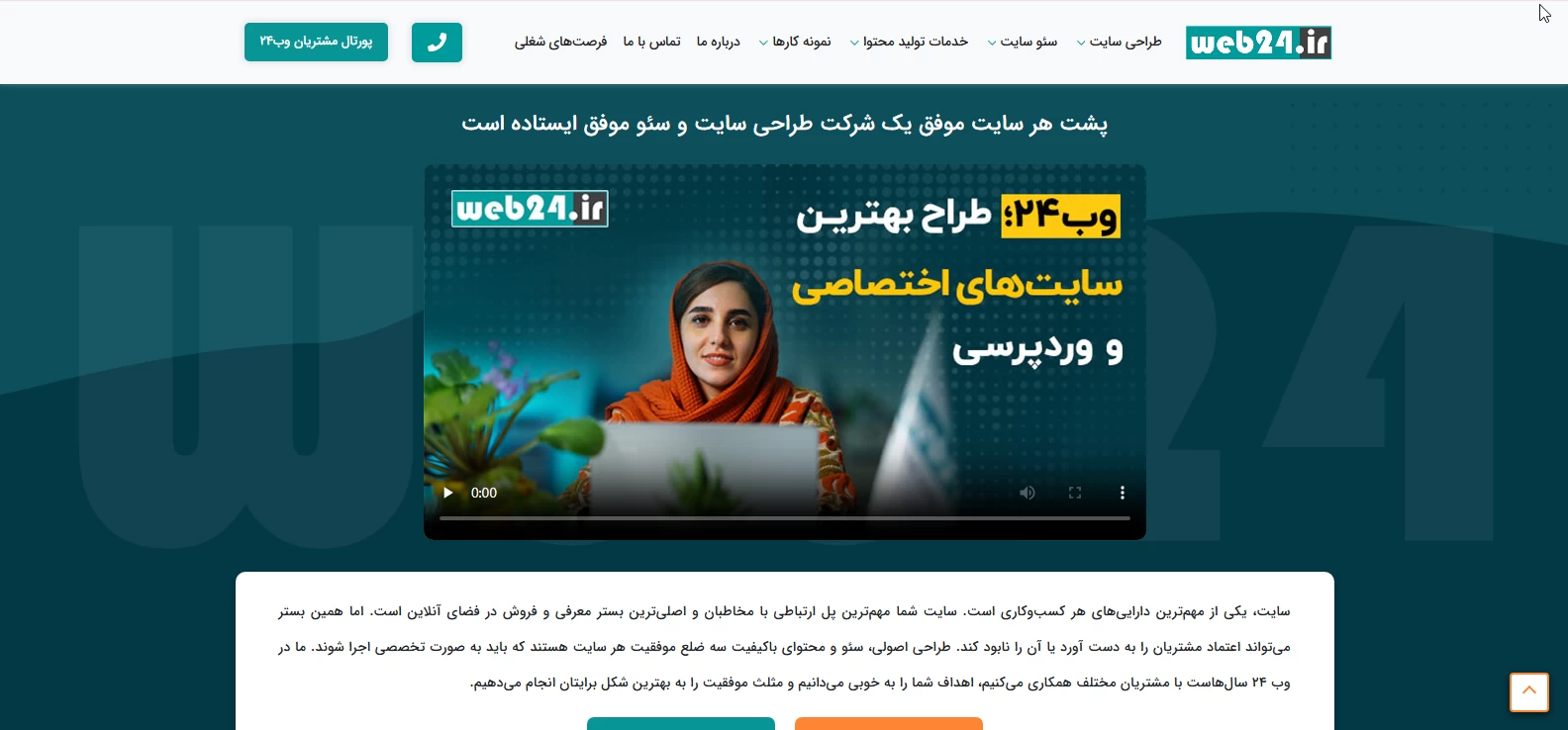 اگر به دنبال یک شرکت طراحی وب سایت حرفه ای می گردید که سابقه بالایی در حوزه سفارش تولید محتوا و خدمات حرفه ای دارد، می توانیم شرکت وب ۲۴ را به شما معرفی کنیم که ۱۴ سال در این حوزه سابقه دارد. این مجموعه با طراحی اصولی سایت و تولید محتوای با کیفیت، سال های سال است که برای کسب و کار های مختلف سایت تخصصی و فروشگاهی طراحی می کند. مجموعه حرفه ای وب ۲۴، خدمات پشتیبانی را به صورت مجزا عرضه می کنند و از ابتدا تا انتهای پروژه در کنار مشتریان خود هستند.